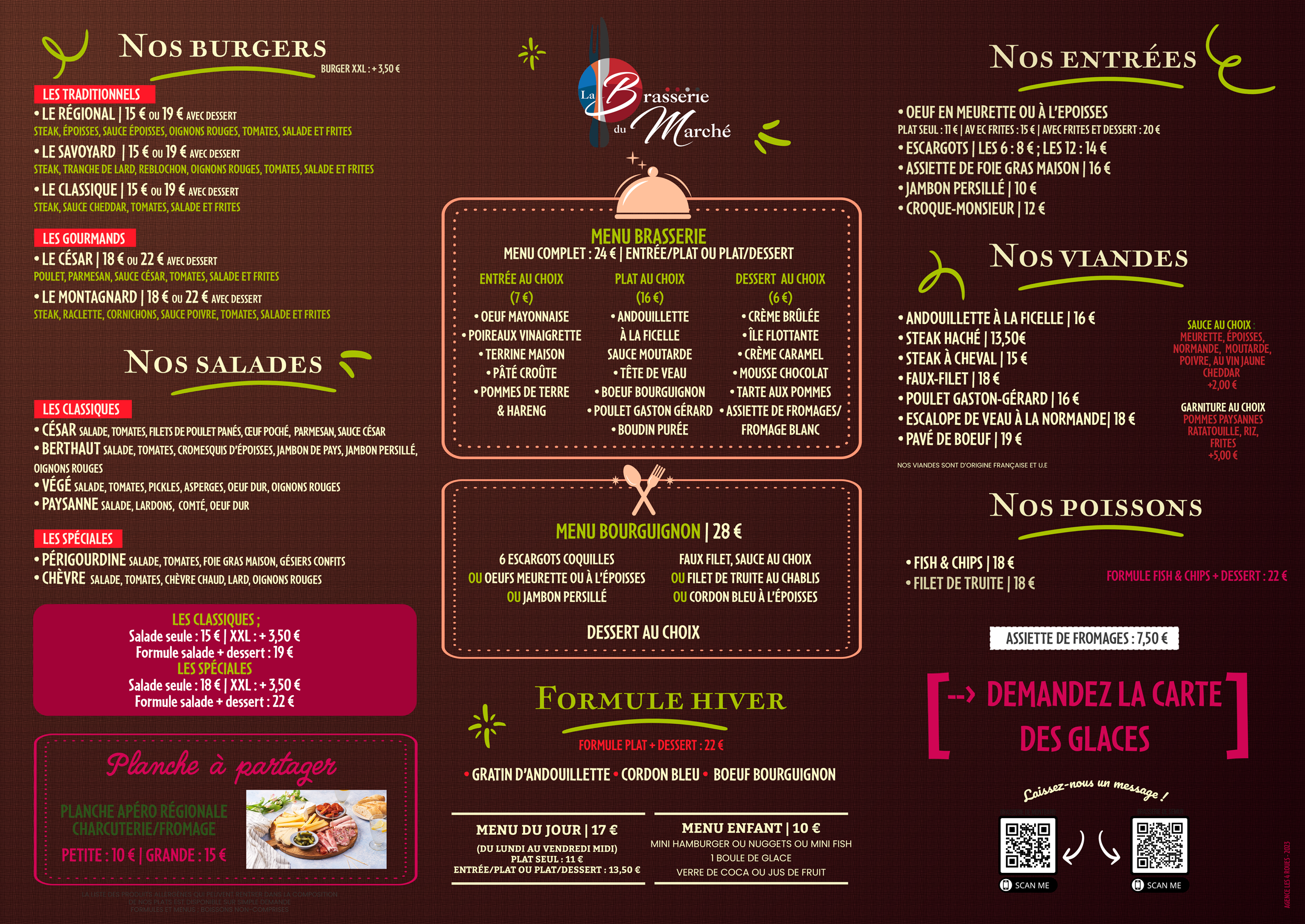 Du lundi au dimanche tous les midis, vous aurez la garantie de vivre un moment sans pareil à deux, entre amis ou en famille. A la Brasserie du Marché nous bénéficions d'un vaste parking à 5 min du centre historique des remparts et de la cité médiévale. Nous proposons une cuisine traditionnelle " fait maison " et de nombreuses spécialités régionales et produits locaux... Une activité bar vous est également proposée, de 7h00 à 19h00 : Petits déjeuners, goûters avec crèpes, gaufres, glaces et smoothies !